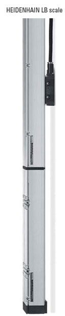 HEIDENHAIN’s longest scale systems are the LBs which utilize a reflective stainless steel tape with a gold graduation (currently 40 µm) as the measuring standard providing a one-piece measuring system with 5 µm /meter accuracy. A series of aluminum extrusions are used to house this tape providing protection from contamination and an accurate mounting surface. Two end caps secure the tape and provide a pre-determined tension factor. The beauty of stainless steel is that it has a similar coefficient of expansion as the machine itself and in many cases the workpiece thus mitigating thermally induced errors.
